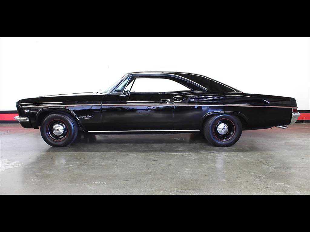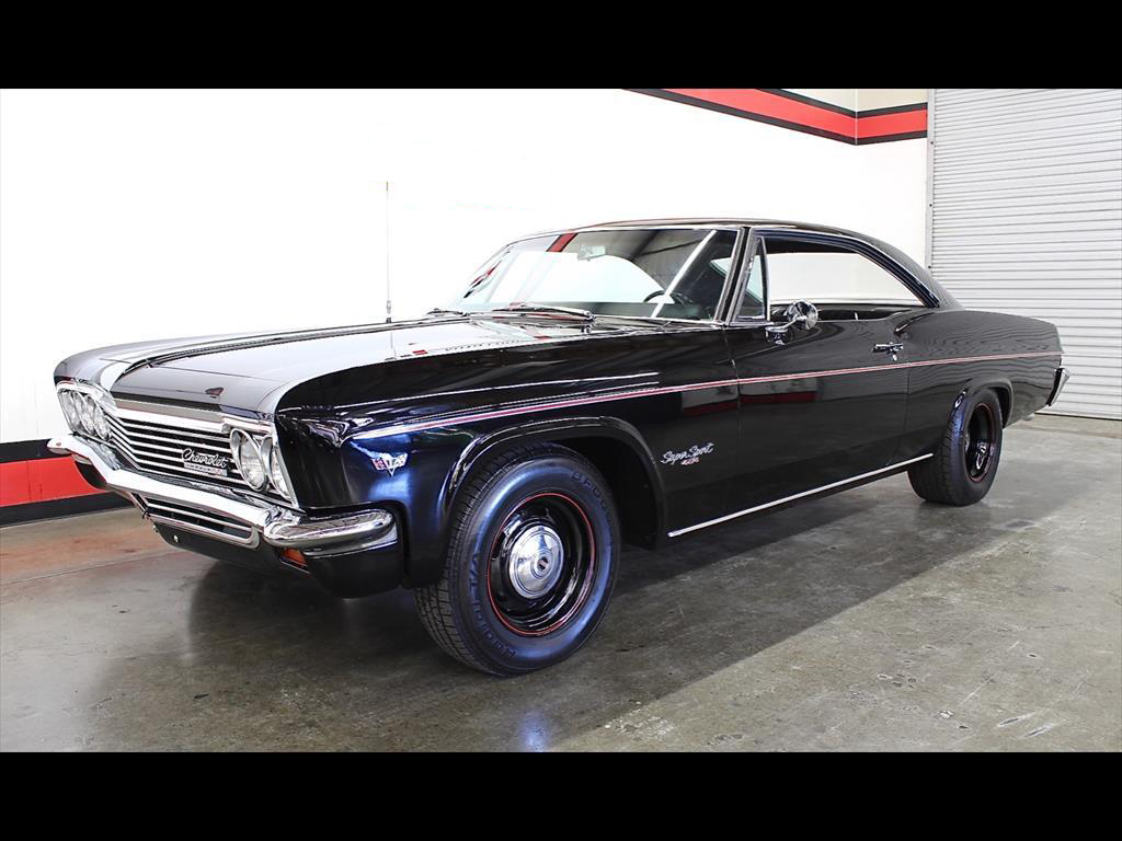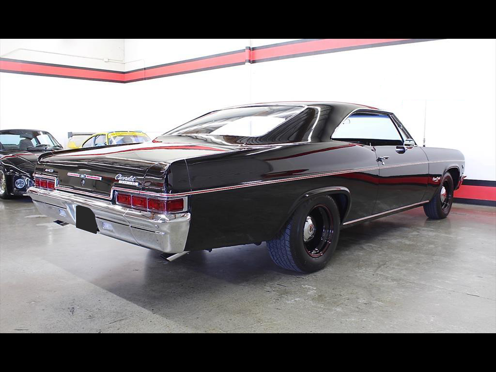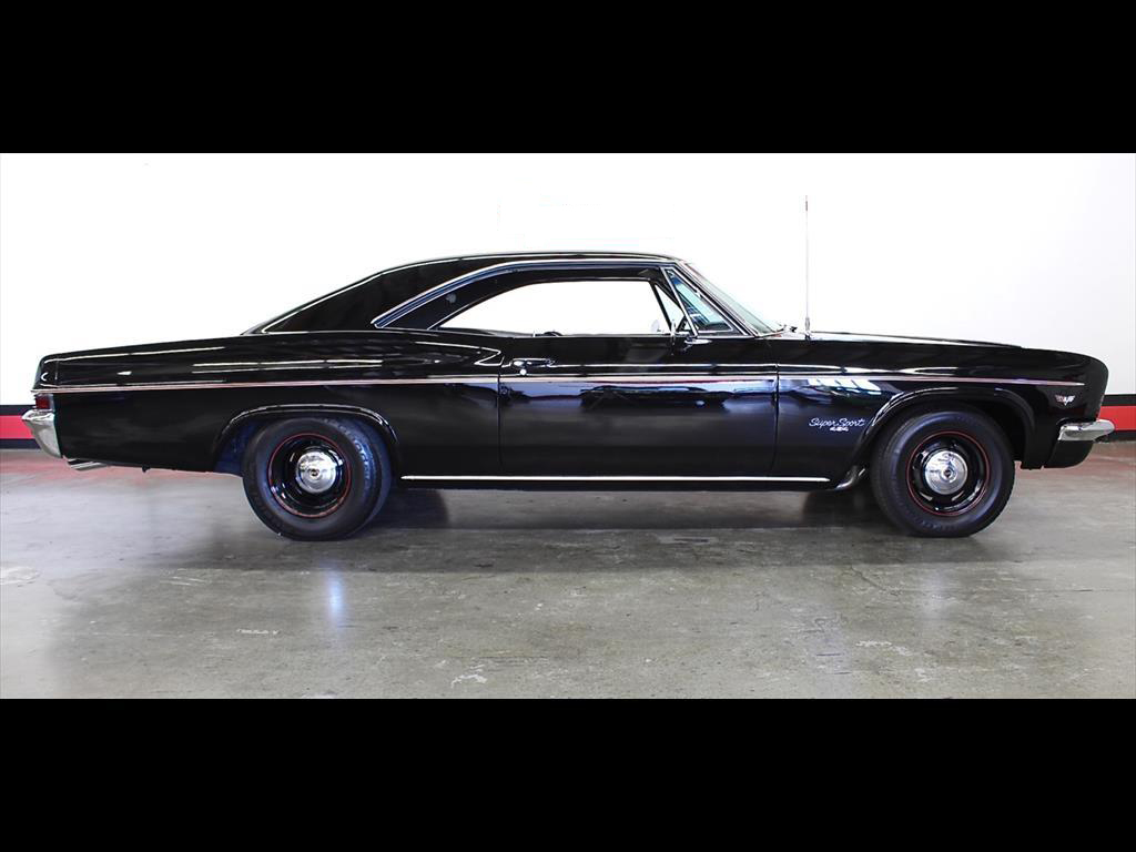 1966 Chevrolet Impala SS in Black over Black Interior. Equipped with an LS6 454ci Engine mated to a Muncie M21 4-Speed Manual Transmission. Documented and professionally restored authentic Super Sport with Protect-O-Plate and original dealer invoice. The engine is a true XAA code 454ci LS6 producing over 500 horsepower. The extremely rare LS6 engine was purchased over the GM parts counter in 1970 and installed into this factory Super Sport. A rust-free no-accident car with straight original body panels and excellent floors. Power steering. Disc brakes. Comes with original owners manual & warranty books. No expense spared on this beautiful restoration.