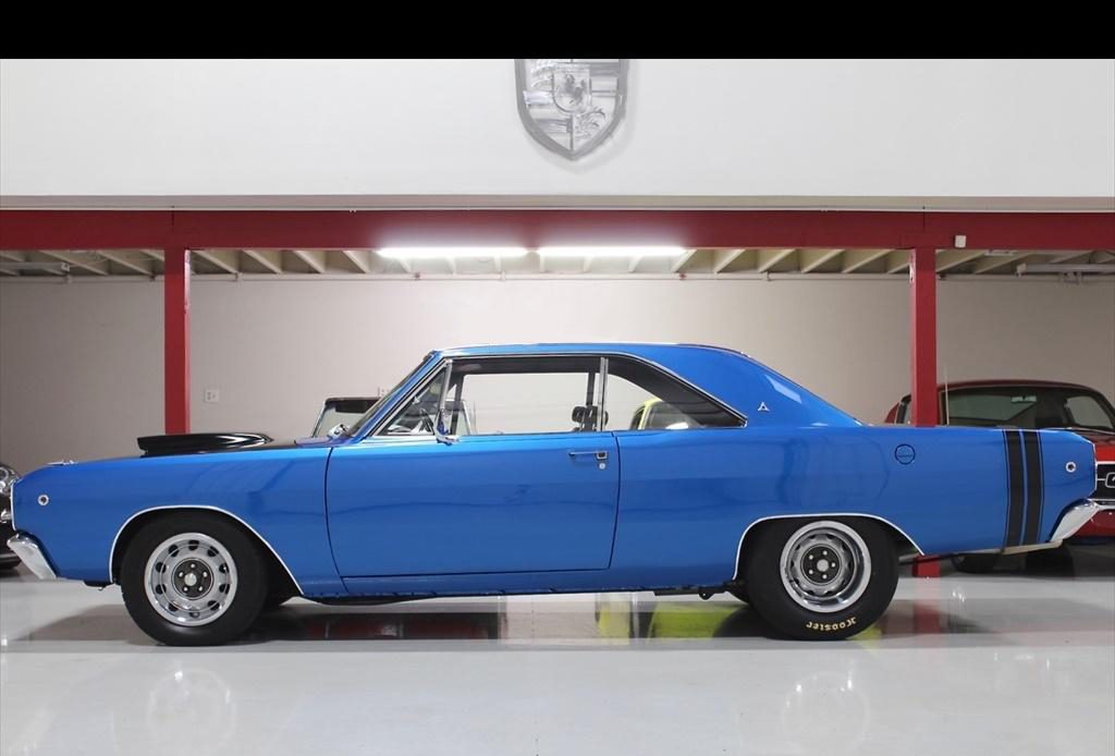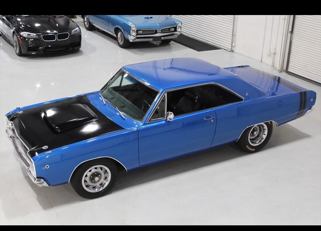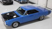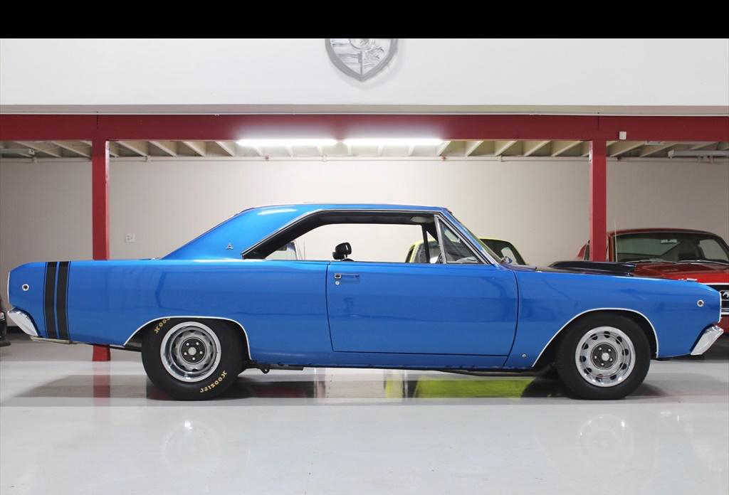 1968 Dodge Dart GT in Blue over Black Interior. Equipped with a 440ci V8 mated to a Built Torqueflite 727 Transmission. This beautiful Dart is a 2-Owner California car that still retains it’s original black license plates. After the original owner passed away, his wife sold the car to the current owner, a local Mopar collector, who decided to perform a complete restoration on the car. Factory bucket seat car with headrests and console. The big block Engine is a 1972 440ci, bored 30 over and balanced. Engine build includes TRW 10:1 Pistons, Steel Crank, Six Pack Rods, Sig Erson High Flow 2 Cam, Hydraulic Lifters, Roller Rockers, 440 Source “Stealth” Aluminum Heads, M1 Intake, and Holley 850 Carb. Engine bay has been cleaned up and wire tucked with hidden hood hinges for a beautiful look. Ceramic Headers and custom dual exhaust. Shift Kit. Slap Stick Shifter. Power Steering with Firm Feel Stage 2 Steering Box. Disc Brakes. Rear End is a rebuilt 8-3/4 Sure-Grip 489 case with 3.91 gears. All new front suspension with Poly bushings and sway bar. Sub-Frame connectors. Caltracs Traction Bars. New gas tank, Electric fuel pump, and new brake lines. All new upholstery and dash pad. Factory console Tach. Instrument cluster restored. AAR Six Pack hood. Rear wheel wells widened with factory look to fit the 265 Hoosier Pro Street Radials. Comes with extensive restoration records from the current owner, and a maintenance log book from the original owner, with logs going from the very day that the car was purchased brand new in 1967, up until his passing in 1993.