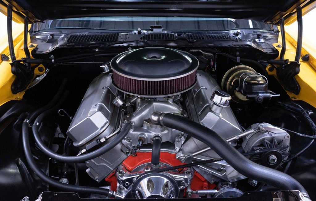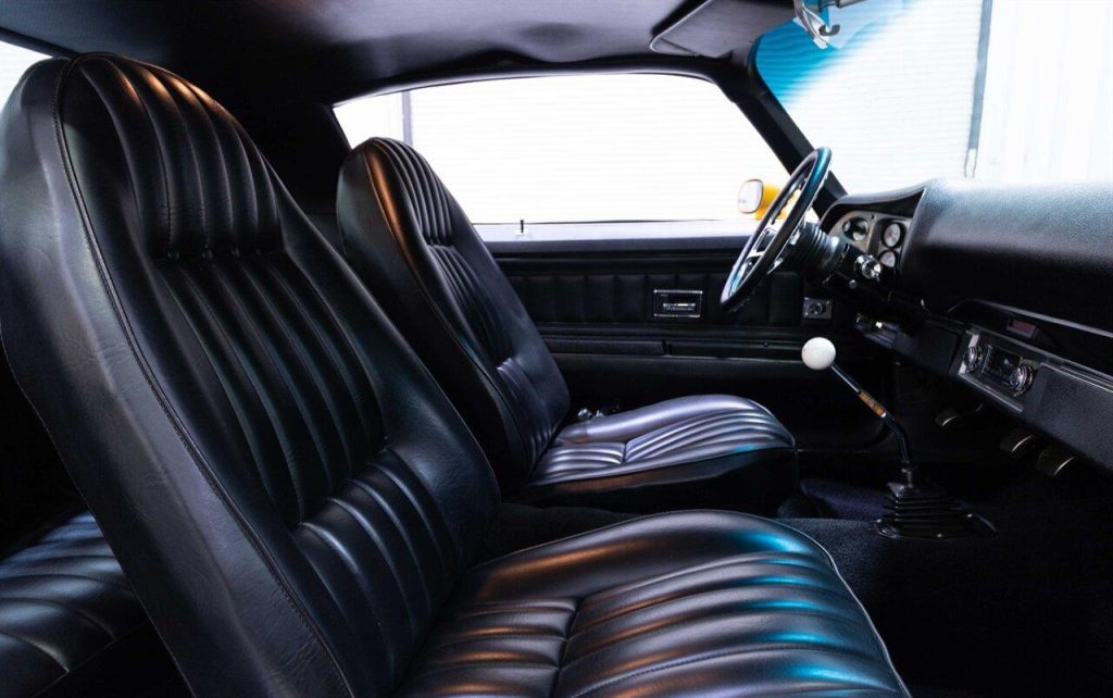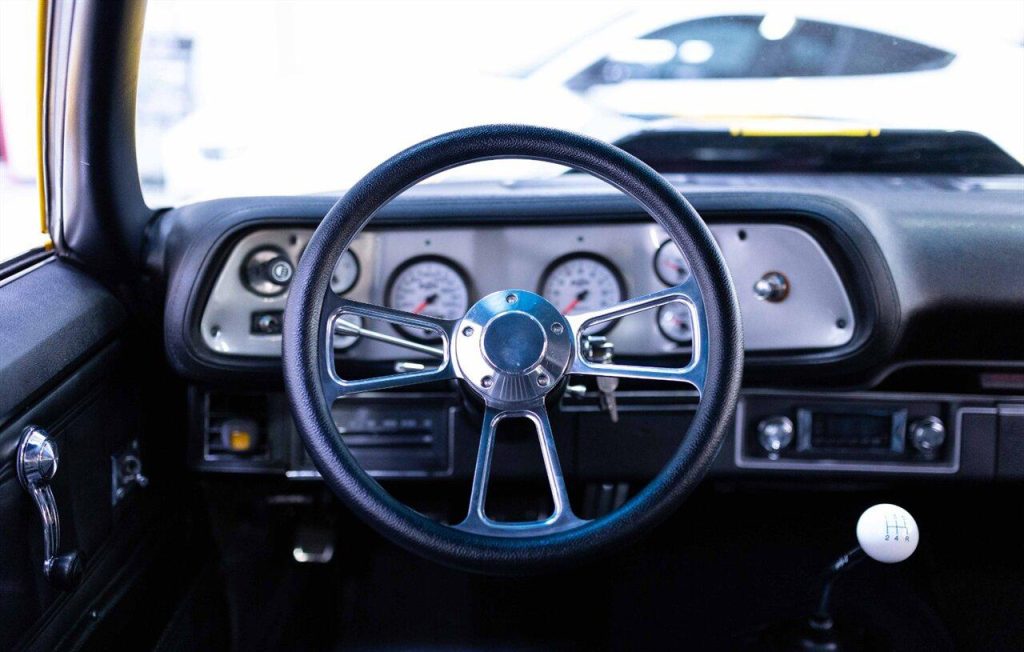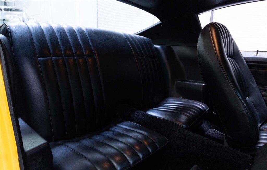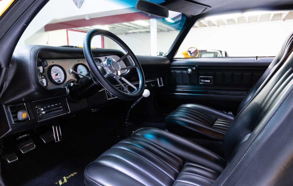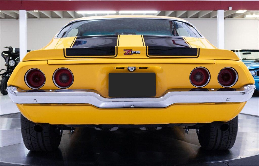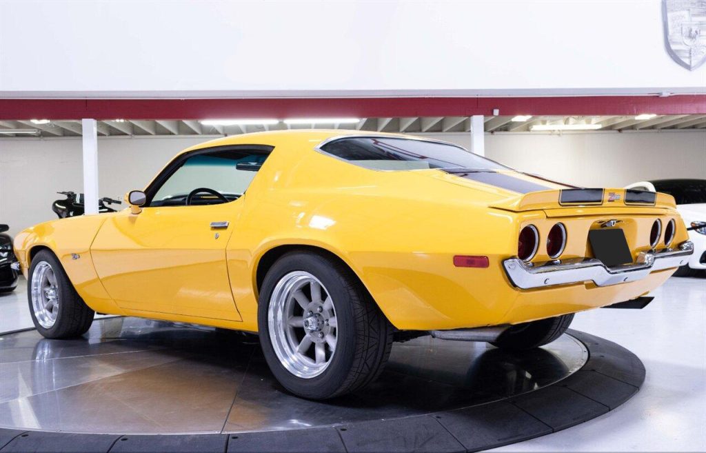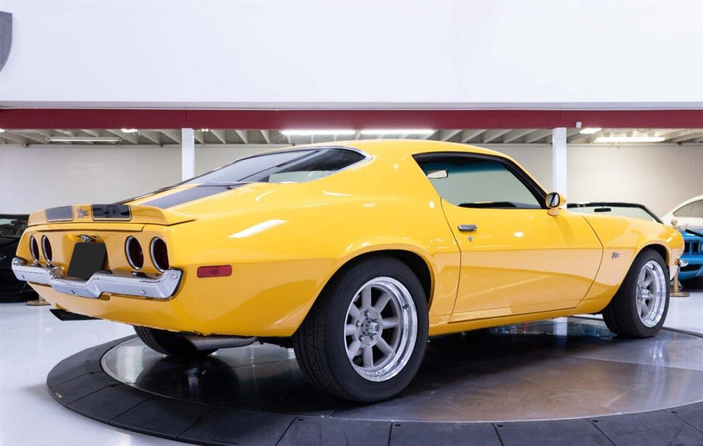 1973 Chevrolet Camaro Restomod in Yellow w/ Black Rally Stripes over Black Interior. Equipped with a built 468ci V8 mated to a Tremec TKO 600 5 Speed Manual Transmission. This incredible Camaro had a ground up restoration including all new glass, interior, paint, and brightwork. Features include: Bow Tie 454 Block, Dart Pro 1 Heads, Roller Cam & Rockers, Edelbrock Intake, 750 CFM Holley Carb, MSD 6al, Hooker Headers w/ 3″ Exhaust, Curry 9″ w/ 4.11 Gears, Flaming River Steering Column w/ Quick Ratio Steering Box, CPP 4 Wheel Disc Brakes, Speed Tech Suspension w/ Coilovers, 3 Core Aluminum Radiator, Vintage Two Piece Wheels wrapped in Brand New Nitto Tires and more!