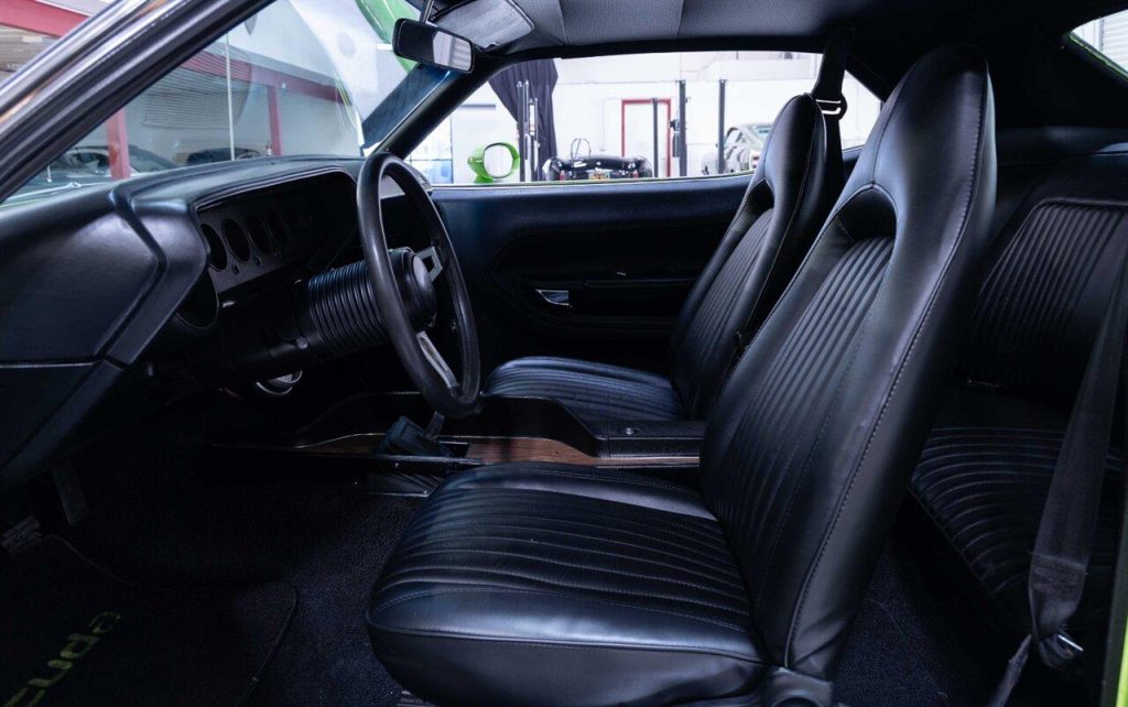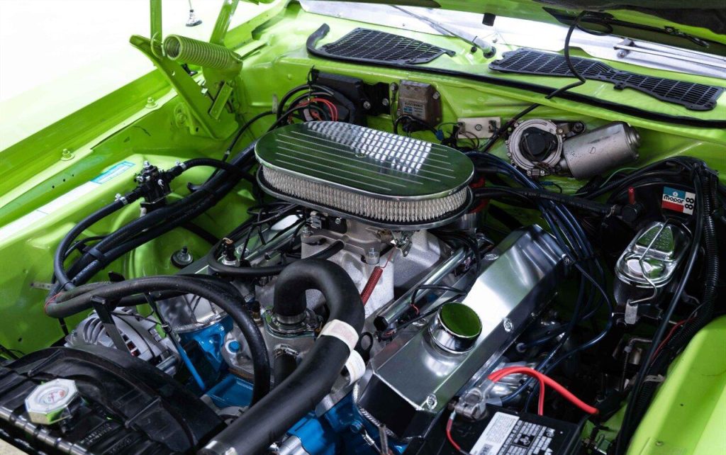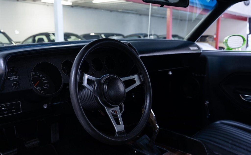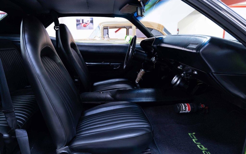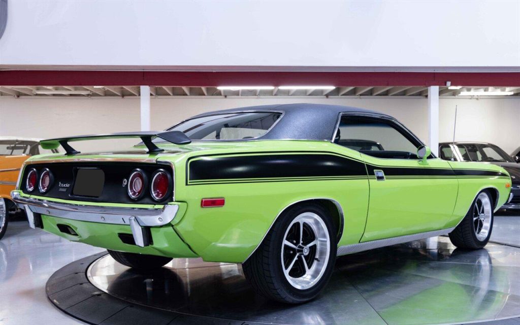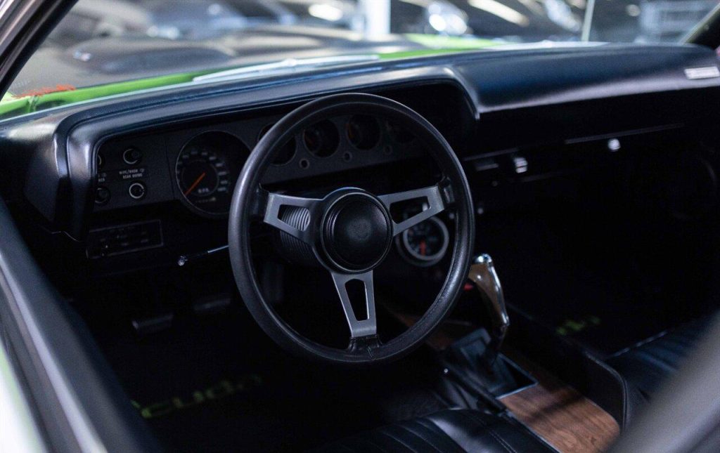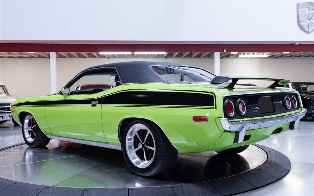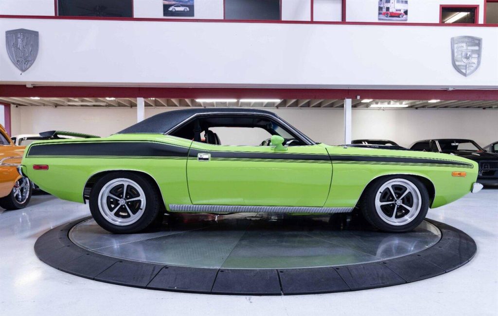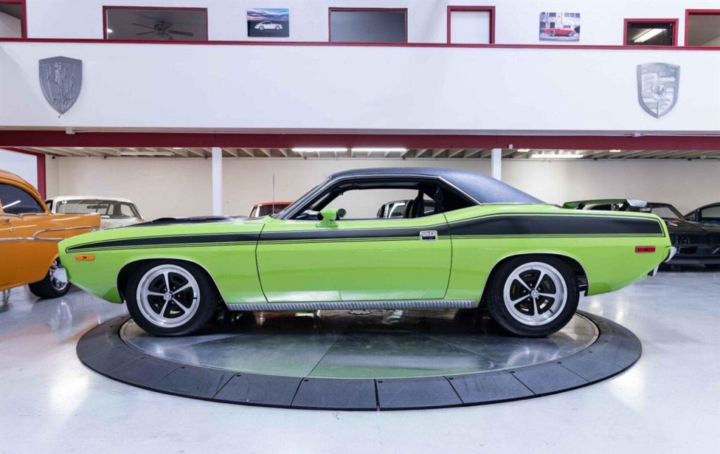 1974 Plymouth Cuda in Sublime Green over Black Leather Bucket Seat Interior. Equipped with a 360ci V8 mated to a 4 Speed Manual Transmission. This Cuda 360 is an excellent example of a rare Mopar. Just 398 Cuda 360’s were produced with a manual transmission in 1974. Features Include: Edelbrock Fuel Injection, Power Disc Brakes, Power Steering, Hurst Pistol Grip Shifter, 3.55 Gears, Vinyl Top, Custom 17″ Wheels, 3 Speed Variable Wipers, AM/FM Radio, Floor Mounted Fire Extinguisher and more! This very solid Cuda is ready to be driven and enjoyed!